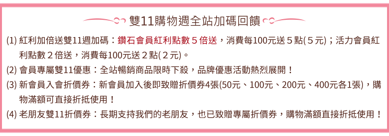 凡於活動期間: 2025/11/01 ~ 2025/11/30, 購買此區商品,任選2件商品,優惠價 9折 。 貼心提醒:任選活動優惠,系統優先折扣高單價品,替您省更多! |