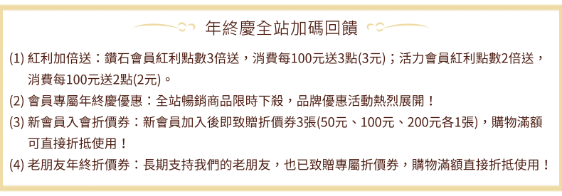 凡於活動期間: 2025/12/23 ~ 2025/12/29, 購買此區商品,任選2件商品,優惠價 8折 。 貼心提醒:任選活動優惠,系統優先折扣高單價品,替您省更多! ※本優惠活動不得與折價券併用。 |